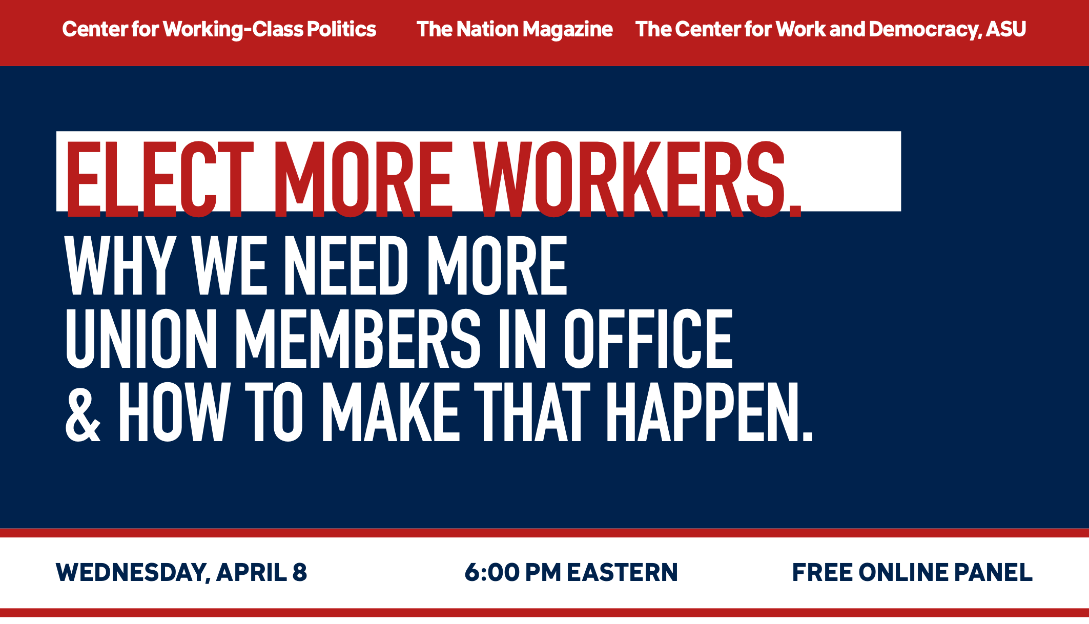 Join the Center for Working Class Politics, the Center for Work and Democracy at ASU and The Nation magazine for a panel featuring veterans of successful union candidate programs who will share their insights and experiences on building a pipeline for working-class candidates and why doing so is more important than ever.